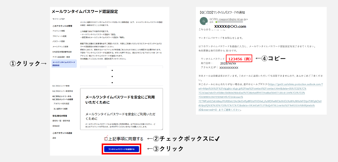 « Step 2 »GビズIDのマイページに戻り、④でコピーしたワンタイムパスワードを入力または、貼り付けます。