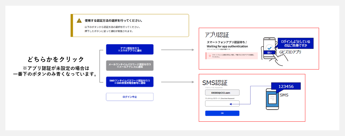 青色になっているボタンのどちらかをクリックし、GビズIDへログインするための認証方法を選択します。