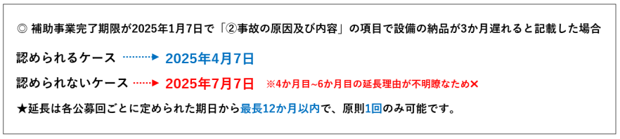 事故等報告はお手続きをされても補助事業完了期限の延長が必ず認められるものではございません。また、審査が厳しく行われるため、承認されるまでに時間を要するため、補助事業完了期限内の完了が困難であることが確定した段階でお手続きされることを推奨しております。