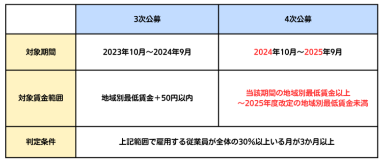 2024年10月~2025年9月の期間中、所定の賃金水準で雇用している従業員が全体の30%以上いる月が3か月以上ある事業者。2.事業場内最低賃金引き上げに係る加点