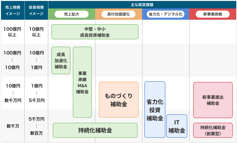 補助金ごとの違いがとても分かりやすくまとめられています。この図をご活用いただき、自社に最適な補助金はどの補助金なのかをお考えいただくヒントにしていただければと思います。