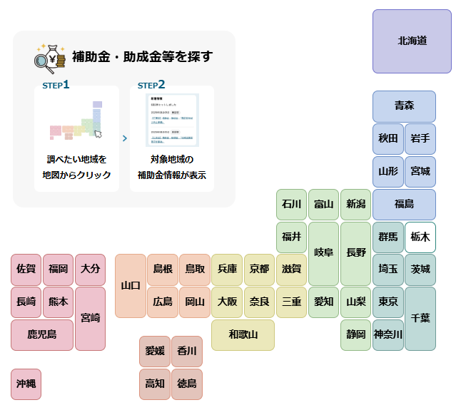 調べたい地域を都道府県の地図から選択し、クリックすると選んだ地域の補助金情報を確認することができます。