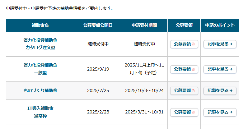 今気になっている補助金の最新情報が知りたいと思った方は、ぜひ、上記の表をご活用ください。