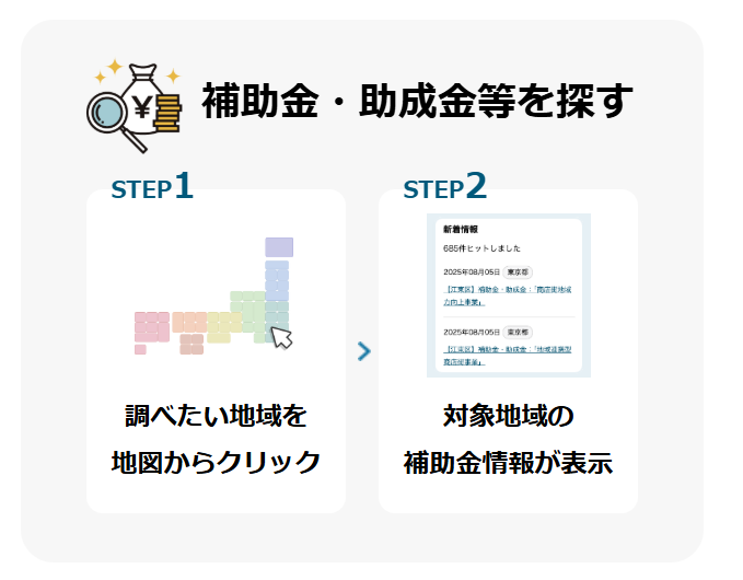 公募中の補助金や助成金が一目でわかるものや、自社が応募できる地方補助金を検索できるサイトがあれば、、
