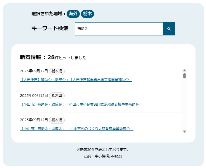 試しに栃木県をクリックしてみると、下記の補助金情報を閲覧することができました。