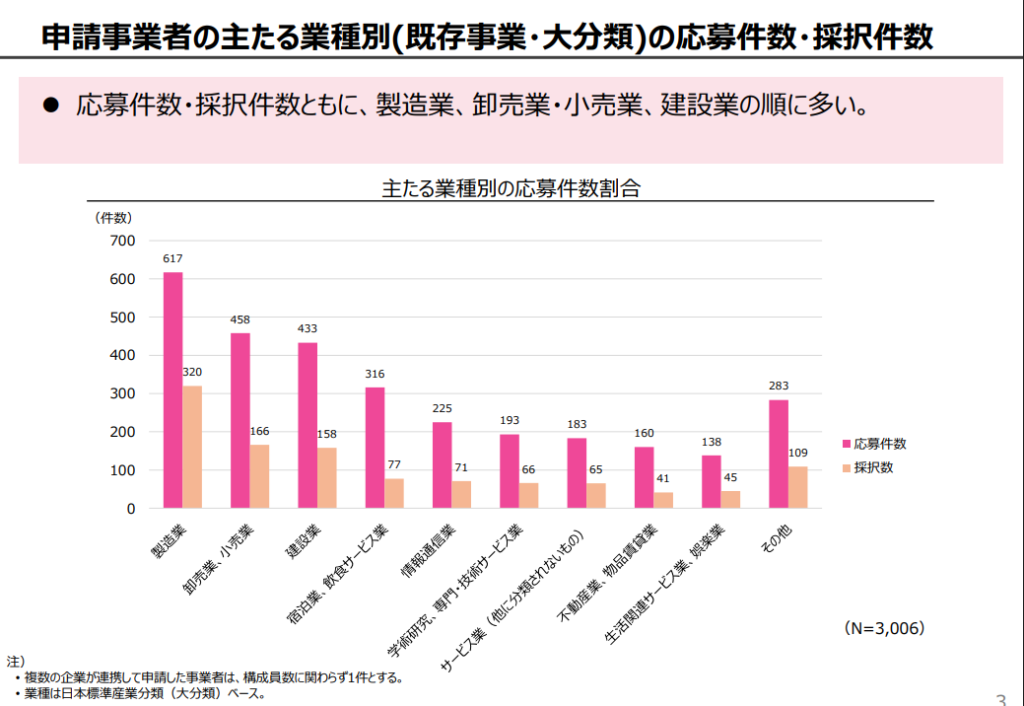 業種別に見ると、申請・採択ともに製造業、卸売・小売業、建設業が上位を占めました。特に製造業は採択率が約52%と他業種より高い傾向にあり、具体的な設備投資計画を立てやすい事業が有利であった可能性がうかがえます。