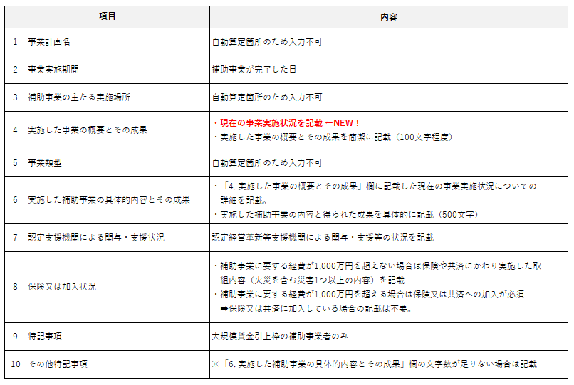 今回の改定より、様式第6の別紙1「4. 実施した事業の概要とその成果」の項目に現在の事業実施状況の記載が追加となりましたのでご注意ください。
